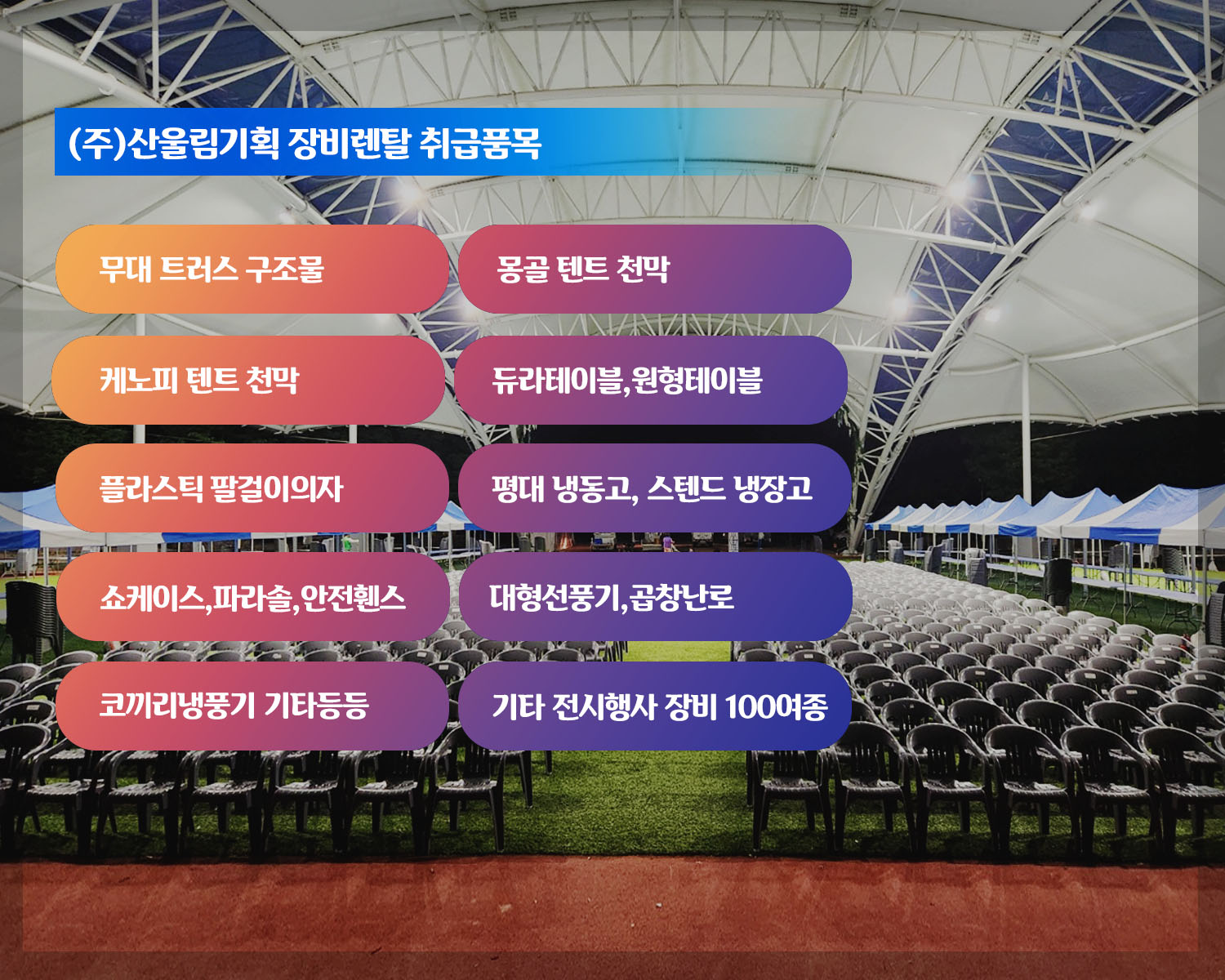 °í°´ÀÇ ¼º°øÀûÀÎ À̺¥Æ®¸¦ À§ÇØ ÃÖ»óÀÇ Çà»ç ´ëÇà ¼ºñ½º¿Í ÃֽŠÀåºñ ·»Å» ¼Ö·ç¼ÇÀ» Á¦°øÇÏ´Â Àü¹® ±â¾÷ÀÔ´Ï´Ù. ÀúÈñ´Â Àü½Ã, Çà»ç, °ø¿¬ µî ´Ù¾çÇÑ ºÐ¾ß¿¡¼ °í°´ÀÇ ¿ä±¸¸¦ ¹Ý¿µÇÑ Ã¢ÀÇÀû ±âȹ°ú ½Å¼ÓÇÑ ½ÇÇà·ÂÀ» ¹ÙÅÁÀ¸·Î ÃÖ»óÀÇ °á°ú¸¦ ¸¸µé¾î³»°í ÀÖ½À´Ï´Ù.